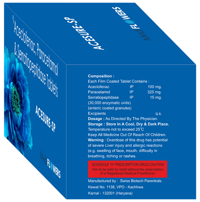 Acesure-SP Tablet is a combination medicine used to relieve pain and swelling in various conditions like muscle pain, joint pain, and postoperative pain. Thus, it effectively alleviates pain and inflammation in conditions like rheumatoid arthritis, ankylosing spondylitis, and osteoarthritis. Acesure-SP Tablet should be taken in the dose and duration as advised by your doctor. It should be taken with food or milk to prevent stomach upset. Taking the medicine regularly at the right times increases its effectiveness. It is important to keep taking the medicine regularly until your doctor tells you it is safe to stop.Nausea, vomiting, stomach pain, indigestion, heartburn, increased liver enzymes, dizziness,drowsiness, and diarrhea are some of the common side effects that might be observed on taking this medicine. Your doctor may regularly monitor your kidney function, liver function, and levels of blood components if you are taking this medicine for long-term treatment. Long-term use may lead to serious complications such as stomach bleeding and kidney problems. Acesure-SP Tablet is not recommended if you are pregnant or breastfeeding.