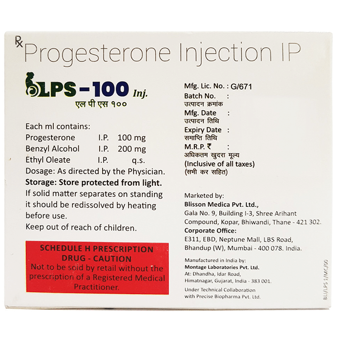 LPS 100 Injection is used to restore menstrual cycles in women whose periods have stopped. It is a natural female hormone important for regulating ovulation (release of an egg from a woman's ovary) and menstruation. It is used in the treatment of infertility to help you get pregnant. You should use LPS 100 Injection as your doctor has advised. Do not use more or less than you have been advised and do not use it for longer than recommended. You may be asked to continue taking this medicine for a period after it is confirmed that you are pregnant.The most common side effects include headache, feeling very tired, weight gain, veginal discharge, stomach cramps, pain or swelling in your abdomen and feeling sick. You may also feel bloated, less interested in sex and get pain or discharge in your vagina. Your doctor or nurse may be able to help you reduce or prevent side effects if they bother you or do not go away. Very occasionally people get a severe allergic reaction which needs urgent medical attention. Using this medicine may increase your risk of blood clots or breast cancer.LPS 100 Injection may not suit everybody, and you should tell your doctor if you have, or have had, breast cancer, unusual bleeding in the vagina or liver disease. You may be monitored more carefully if you have liver, kidney or heart problems or have diabetes or asthma. Let your doctor know your medical history to be safe. Check with your doctor about all other medicines which may affect, or be affected by, this medicine. You will probably have several tests both before and during treatment to check your womb. This medicine can alter your thinking or reactions and you may feel very tired so be careful if you drive or need to be alert. In general, alcohol is not recommended while taking this medicine.