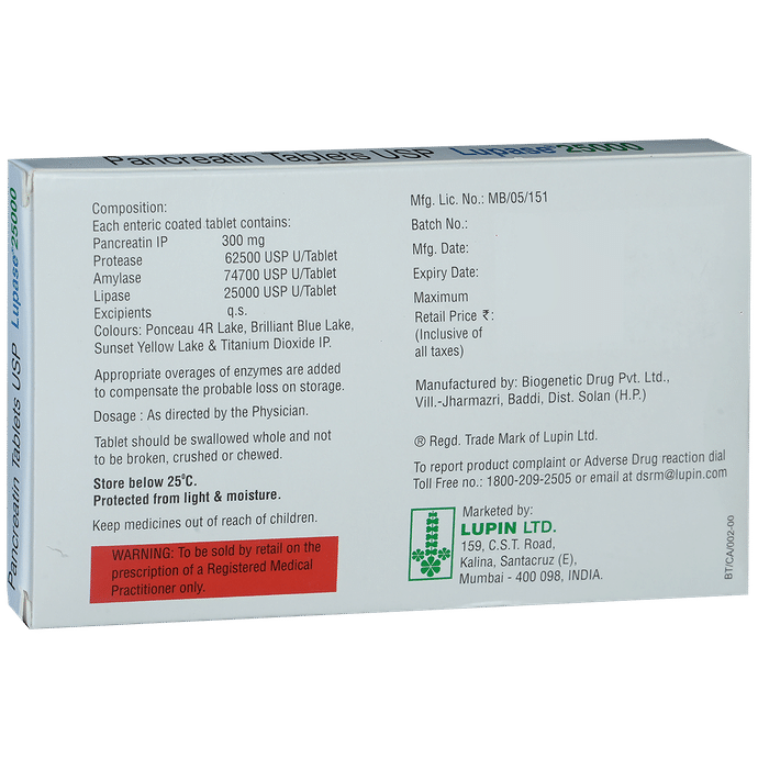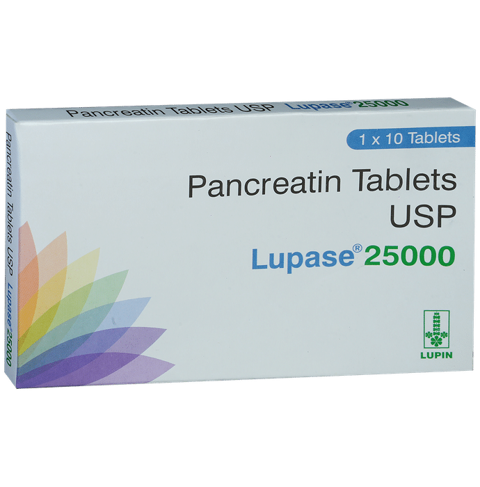 Lupase 25000 Tablet is used to treat pancreatic enzyme deficiency. It is a pancreatic enzyme supplement that helps in digestion. This medicine also reduces stool frequency and stomach discomfort. Lupase 25000 Tablet should be taken during or immediately after eating a meal or a snack with plenty of water. This helps the enzymes mix with the food so they can help digest it. The dose you