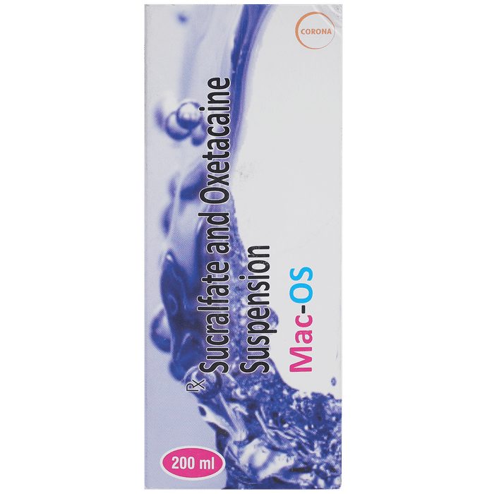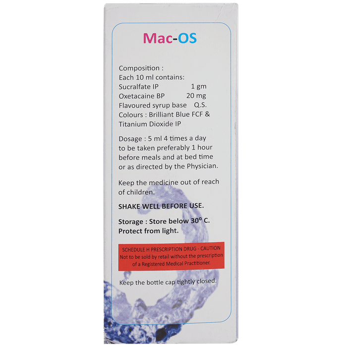 Mac OS Suspension is a combination medicine used in the treatment of acidity, stomach ulcer, and heartburn. It helps in relieving the symptoms of acidity and ulcers such as stomach pain or irritation. It also neutralizes excessive acid in the stomach and helps in the easy passage of gas. Mac OS Suspension is taken without food in a dose and duration as advised by the doctor. The dose you are given will depend on your condition and how you respond to the medicine. You should keep taking this medicine for as long as your doctor recommends. If you stop treatment too early your symptoms may come back and your condition may worsen. Let your healthcare team know about all other medications you are taking as some may affect, or be affected by this medicine. Do not take it for more than the recommended duration as long-term administration may have harmful effects on the health.The most common side effects are constipation, nausea, vomiting, dizziness, insomnia, and allergic reaction. These are temporary and usually resolve with time. Contact your doctor straight away if you are at all concerned about any side effects. To overcome constipation, you should add fiber-rich foods in your diet and stay hydrated. It may also cause dizziness and sleepiness, so do not drive or do anything that requires mental focus until you know how this medicine affects you. Avoid drinking alcohol while taking this medicine as it can worsen your sleepiness. Lifestyle modifications like having cold milk and avoiding hot tea, coffee, spicy food or chocolate can help you to get better results.Before taking this medicine, you should tell your doctor if you are pregnant, planning pregnancy or breastfeeding. You should also tell your doctor if you have any liver diseases so that your doctor can prescribe a suitable dose for you.