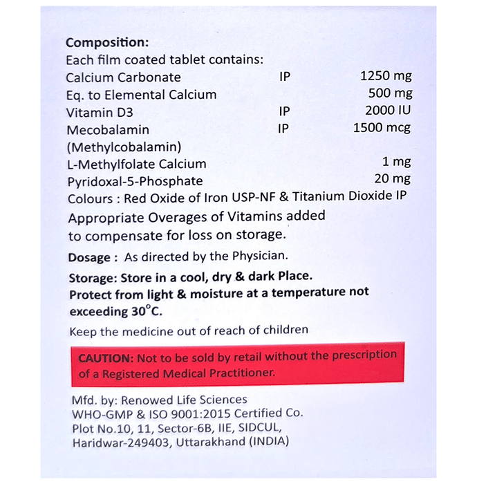 Calcium Carbonate (1250mg) + Vitamin D3 (2000IU) + Methylcobalamin (1500mcg) + L-Methyl Folate Calcium (1mg) + Pyridoxal-5-phosphate (20mg)