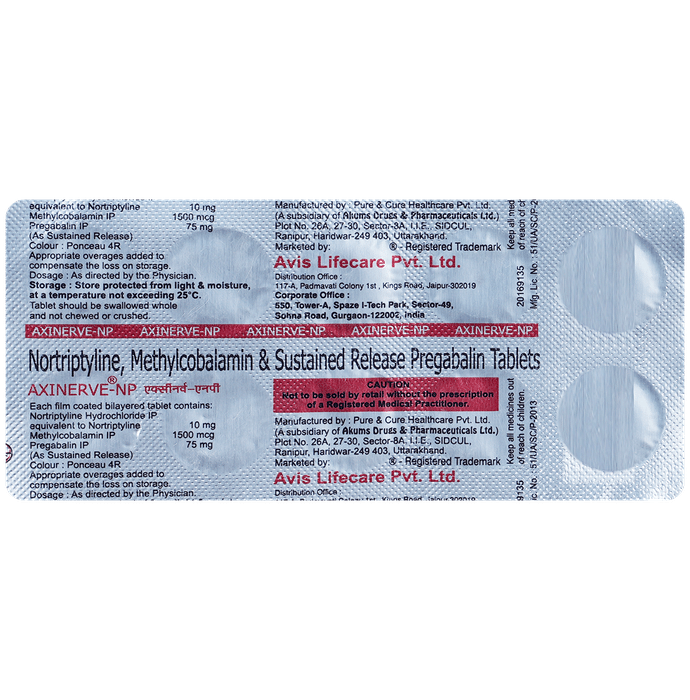 Axinerve-NP Tablet is a combination medicine used to treat neuropathic pain. It works by decreasing pain by controlling calcium channel activity of the nerve cells. It also increases the level of chemical messengers in the brain that help in regulating the mood and protect nerve fibers. Axinerve-NP Tablet can be taken with or without food. However, it is advised to take it at the same time each day as this helps to maintain a consistent level of medicine in the body. Take this medicine in the dose and duration advised by the doctor. If you miss a dose of this medicine, take it as soon as you remember. Finish the full course of the treatment even if you feel better. It is important not to stop taking this medicine suddenly as it may worsen your symptoms.Some common side effects of this medicine include constipation, weight gain, and dryness in mouth. It may cause dizziness and sleepiness, so do not drive or do anything that requires mental focus until you know how this medicine affects you. This medicine may cause weight gain and to control it, you should have a balanced diet and exercise regularly. You must inform your doctor if you develop any unusual changes in mood or behavior, new or worsening depression, or suicidal thoughts.Before taking this medicine let your doctor know if you suffer from kidney or liver disease. Your doctor should also know about all other medicines you are taking as many of these may make this medicine less effective or change the way it works. Inform your doctor if you are pregnant, planning pregnancy or breastfeeding.
