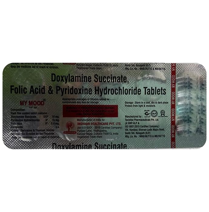 MY Mood Tablet is a combination medicine used in the treatment of nausea or vomiting during pregnancy. It blocks signals to reach the brain that trigger the feeling of nausea and vomiting. MY Mood Tablet is taken with or without food in a dose and duration as advised by the doctor. The dose you are given will depend on your condition and how you respond to the medicine. You should keep taking this medicine for as long as your doctor recommends. If you stop treatment too early your symptoms may come back and your condition may worsen. Let your healthcare team know about all other medications you are taking as some may affect, or be affected by this medicine.The most common side effects are dryness in the mouth, constipation, and lightheadedness. Most of these are temporary and usually resolve with time. Contact your doctor straight away if you are at all concerned about any of these side effects. This medicine can also cause dizziness and sleepiness, so do not drive or do anything that requires mental focus until you know how this medicine affects you. Avoid drinking alcohol while taking this medicine as it can worsen your sleepiness.
