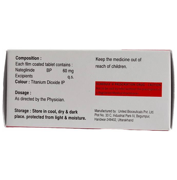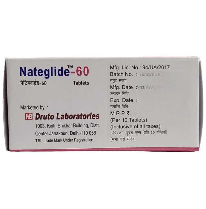 Nateglide 60mg Tablet is used to lower blood sugar levels in adults with type 2 diabetes mellitus. It is usually prescribed along with other diabetes medicines to achieve adequate blood sugar control. It also prevents serious complications of diabetes like kidney damage and blindness. Nateglide 60mg Tablet is normally prescribed when diet and exercise alone or other medicines have not been enough to control your blood sugar level. It works best when taken before meals. The dose will depend on your condition, and blood sugar levels, but you should use it as advised by your doctor.You should take it regularly, at the same time each day, to get the most benefit and you should not stop unless your doctor recommends it. It is controlling your blood sugar levels and helping to prevent serious complications in the future. It is important to stay on the diet and exercise program recommended by your doctor while taking this medicine. Your lifestyle plays a big part in controlling diabetes.The most common side effects of this medicine include upper respiratory tract infection, back pain, diarrhea, flu symptoms, dizziness, and joint pain. Contact your doctor if the side effects worry you or if they do not go away.Before taking this medicine, let your doctor know if you have ever had kidney disease, heart or pancreas problems, or if you drink a lot of alcohol. Pregnant or breastfeeding women should also consult their doctor before taking it. Some other medicines you are taking may interfere with it so make sure your doctor knows about all the other medicines you are using. Limit your alcohol intake while taking this medicine because it can increase your risk of developing low blood sugar levels. You may need regular tests such as kidney function and blood glucose levels to check that the medicine is working properly.