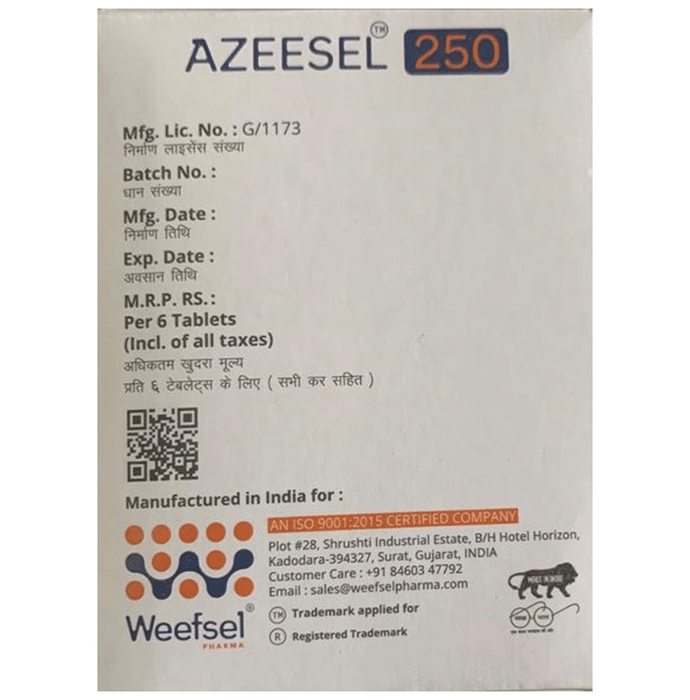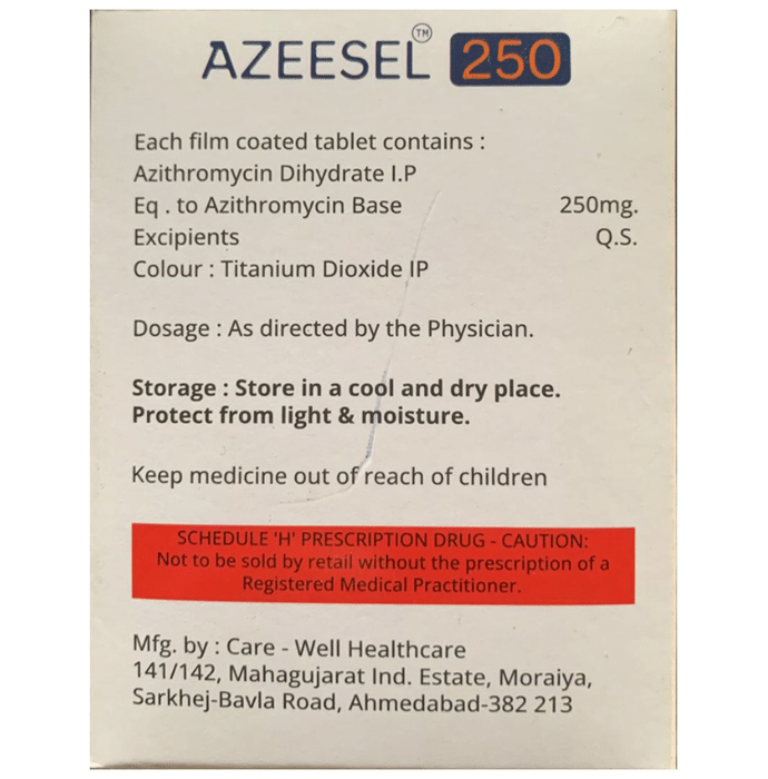 Azeesel 250 Tablet is an antibiotic used to treat various types of bacterial infections of the respiratory tract, ear, nose, throat, lungs, skin, and eye in adults and children. It is also effective in typhoid fever and some sexually transmitted diseases like gonorrhea. Azeesel 250 Tablet is taken orally, preferably one hour before or 2 hours after a meal. It should be used regularly at evenly spaced time intervals as prescribed by your doctor. Do not skip any doses and finish the full course of treatment even if you feel better. Stopping the medicine too early may lead to the return or worsening of the infection.Commonly seen side effects seen with this medicine include vomiting, nausea, stomach pain, headache, and diarrhea. These are usually temporary and subside with the completion of treatment. Consult your doctor if you find these side effects worry you or persist for a longer duration.Do not use Azeesel 250 Tablet if you have a history of cholestatic jaundice or hepatic dysfunction that happened with the use of azithromycin. Inform your doctor if you have any previous history of allergy or heart problems before taking this medicine. Pregnant or breastfeeding women should consult their doctor before using this medicine.