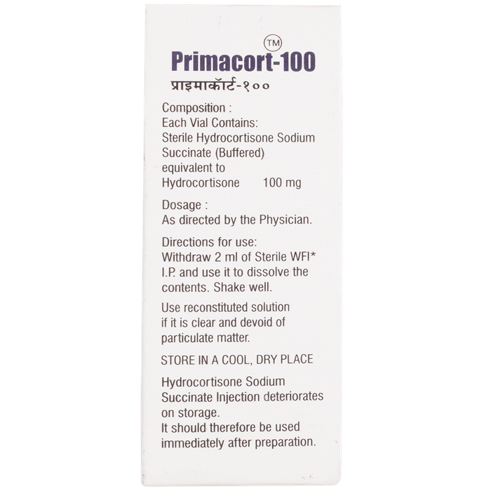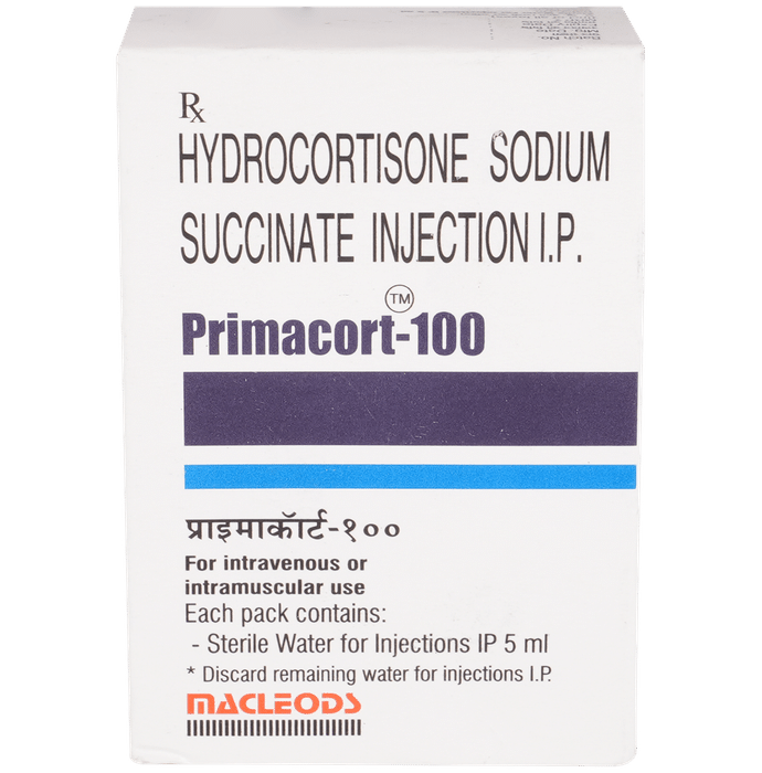 Primacort 100 Injection belongs to a group of medicines called corticosteroids. It is used to treat a variety of diseases and conditions such as severe allergic reactions, allergic conditions, cancer, and skin and eye disorders. It is used for the treatment of conditions that need a quick response. Primacort 100 Injection is administered by a healthcare professional. It is usually given to patients who are not able to take the tablet form of the medicine. Taking the medicine can make it harder for your body to fight off infections. Tell your doctor if you have any signs of infection such as a fever or sore throat. Also before taking this medicine, you should let your doctor know all the other medicines you are taking.The most common side effect of this medicine is intense pain and swelling in the joint where the injection was given. This usually gets better after a few days. It may also cause mood changes in some people. If any of these side effects bother you or if you experienced any symptoms which you feel are due to the use of this medicine, let your doctor know.Primacort 100 Injection is contraindicated in patients with systemic fungal infections. Additionally, avoid the use of this medicine if you have a known history hypersensitivity to any components of this product. it is important for pregnant and breastfeeding mothers to ask the advice of their doctors before taking this medicine.
