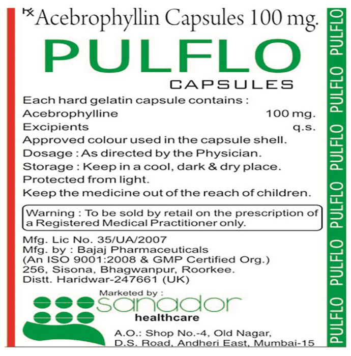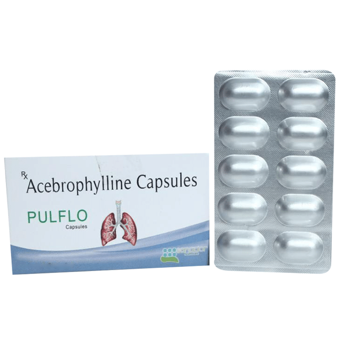 Pulflo 100mg Capsule is used to treat and prevent symptoms of asthma, bronchitis, and chronic obstructive pulmonary disorder (a lung disorder in which flow of air to the lung is blocked). It helps in relaxing the muscles of the air passages, thus widening it and making it easier to breathe. Pulflo 100mg Capsule can be taken with the food in evening. Take it at the same time every day to get the most benefit. The dose and how often you take it depends on what you are taking it for. Your doctor will decide how much you need to improve your symptoms. Take this medicine for as long as it is prescribed for you. Do not miss even a single dose, if in any case, you missed a dose, take it as soon as you remember or better to skip the missed dose and continue with regular dosing. It does not work immediately or prevent the already started breathing trouble, hence always carry your medical inhaler with you for an emergency.The most common side effects of this medicine include abdominal discomfort, abdominal distension, vomiting, abdominal pain, diarrhea, constipation, and heart burn. If these bother you or appear serious, let your doctor know. There may be ways of reducing or preventing them. Generally, it is advised not to consume alcohol or do not smoke while on treatment.Before taking this medicine, let your doctor if you have kidney or liver disease or if you have heart-related problems. Your doctor should also know about all other medicines you are taking as many of these may make this medicine less effective or change the way it works. Inform your doctor if you are pregnant or breastfeeding before starting the treatment.