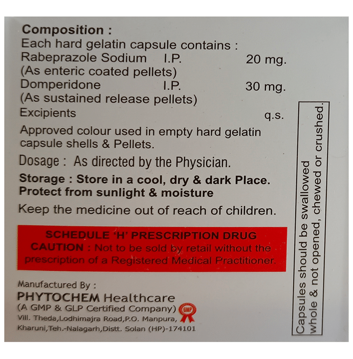 Rabenza-D Capsule SR is a combination medicine used to treat gastroesophageal reflux disease (Acid reflux). It works by relieving the symptoms of acidity such as heartburn, stomach pain, or irritation. It also neutralizes the acid and promotes easy passage of gas to reduce stomach discomfort. Rabenza-D Capsule SR is taken without food in a dose and duration as advised by the doctor. The dose you are given will depend on your condition and how you respond to the medicine. You should keep taking this medicine for as long as your doctor recommends. If you stop treatment too early your symptoms may come back and your condition may worsen. Let your healthcare team know about all other medications you are taking as some may affect, or be affected by this medicine.The most common side effects are diarrhea, stomach pain, dryness in the mouth, headache, flatulence, and weakness. Most of these are temporary and usually resolve with time. Contact your doctor straight away if you are at all concerned about any of these side effects. This medicine may cause dizziness and sleepiness, so do not drive or do anything that requires mental focus until you know how this medicine affects you. Avoid drinking alcohol while taking this medicine as it can worsen your sleepiness. Lifestyle modifications like having cold milk and avoiding hot tea, coffee, spicy food or chocolate can help you to get better results.Before you start taking this medicine it is important to inform your doctor if you are suffering from kidney or liver disease. You should also tell your doctor if you are pregnant, planning pregnancy or breastfeeding.