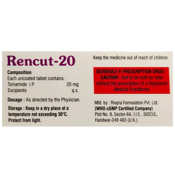 Rencut 20 Tablet belongs to a group of medicines called diuretics or water tablets. It is used to reduce the swelling (edema) caused by too much water in the body in people who have heart failure, liver disease, or kidney disease. This medicine is also used to treat high blood pressure. Rencut 20 Tablet helps your body get rid of extra water and salt through urine. It may be used alone or in combination with other medicines as per the dose advised by your doctor. It can be taken with or without food and should be taken at the same time each day. It is best to avoid taking this medicine within 4 hours of your bedtime to prevent having to get up at night to urinate.It is important to continue taking this medication even if you feel well. If you stop taking it without consulting your doctor, your condition may worsen. Lifestyle changes like reducing stress, restricting salt intake, and stopping smoking may help this medication work better.Common side effects of this medicine include headache, dizziness, dehydration, decreased blood pressure, and stomach upset. These are usually mild and disappear after a short time. Consult your doctor if they bother you or do not go away.Before taking this medicine, let your doctor know if you have any liver problems. Pregnant or breastfeeding women should also consult their doctor before taking it. Regular monitoring of kidney function and electrolyte levels is important while using this medicine. It may reduce the potassium level in your blood so your doctor may ask you to add potassium-rich foods to your diet (such as bananas, coconut water, etc.) or prescribe supplements.
