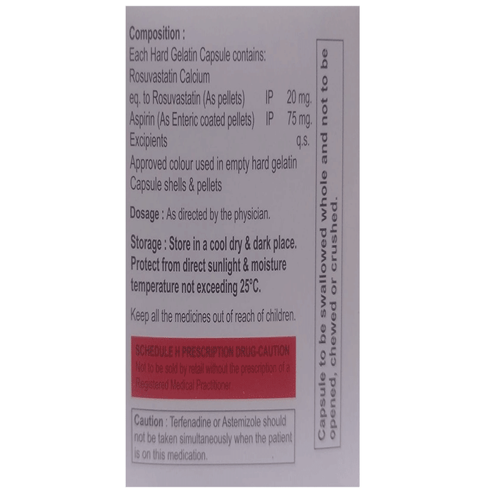 Rostrac-ASP 20/75 Capsule is a combination of two medicines used to prevent heart attack, stroke, and angina. This medicine reduces the '__'bad'__' cholesterol (LDL) and triglycerides (fats) levels. Moreover, it also decreases the formation of blood clots. Rostrac-ASP 20/75 Capsule should be taken with food to avoid stomach upset. You should take it regularly at evenly spaced intervals as per the schedule prescribed by your doctor. Taking it at the same time every day will help you remember to take it. The dose and duration of treatment will depend on what you are being treated for. Do not stop taking it until you have finished the complete course, even when you feel better. Lifestyle changes like low-fat diet, exercise and not smoking may help this medicine to work better.Nausea, abdominal pain, headache, and constipation are some common side effects of this medicine.This medicine increases your risk of bleeding, so it is important to be careful while shaving, cutting nails, using sharp objects, or engaging in contact sports (e.g., football, wrestling). Let your doctor know if you notice yellowing of skin, muscle pain or dark urine.Before taking this medicine, tell your doctor if you have liver or kidney disease or you are suffering from bleeding disorder. You must tell your doctor if you are pregnant, planning pregnancy or breastfeeding. You should also let your healthcare team know all other medicines you are taking as they may affect, or be affected by this medicine.