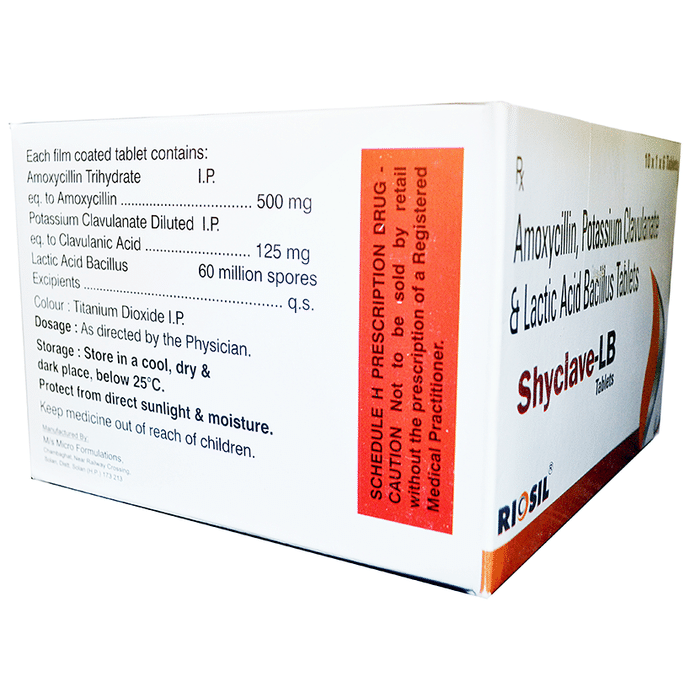 Shyclave-LB Tablet is a combination medicine that is used to treat various types of bacterial infections. It fights against the microorganisms to prevent their growth and further spread of the infection. It also prevents diarrhea which may occur as side effect of this medicine. Shyclave-LB Tablet is a prescription medicine. It is advised to take it as per the prescription. It can be taken with or without food, but it must be taken at a fixed time to ensure better efficacy. Do not consume more than the recommended dose, as this may have harmful effects on your body. If you miss a dose, take it as soon as you remember. The course of the treatment must be completed even if you feel better. Sudden discontinuation of the treatment may affect the potency of the medicine.Some common side effects of this medicine are nausea, vomiting, diarrhea, indigestion, etc. If any of the side effects get aggravated, you must consult your doctor immediately. If you experience any allergic reaction (rashes, itching, swelling, shortness of breath, etc.), you must seek immediate medical help.Before taking this medicine, you should tell your doctor if you are taking any medicines for any health condition. Pregnant or breastfeeding women should also consult with their doctor before taking it. Avoid drinking alcohol as it can cause excessive drowsiness with this medicine. It usually does not impair your ability to drive, but you should not drive if it makes you feel sleepy or dizzy. You must take adequate rest for a faster recovery, also take a healthy diet and drink plenty of water. Your doctor may ask for a few laboratory and diagnostic tests to know the effects of the medicine on your body.