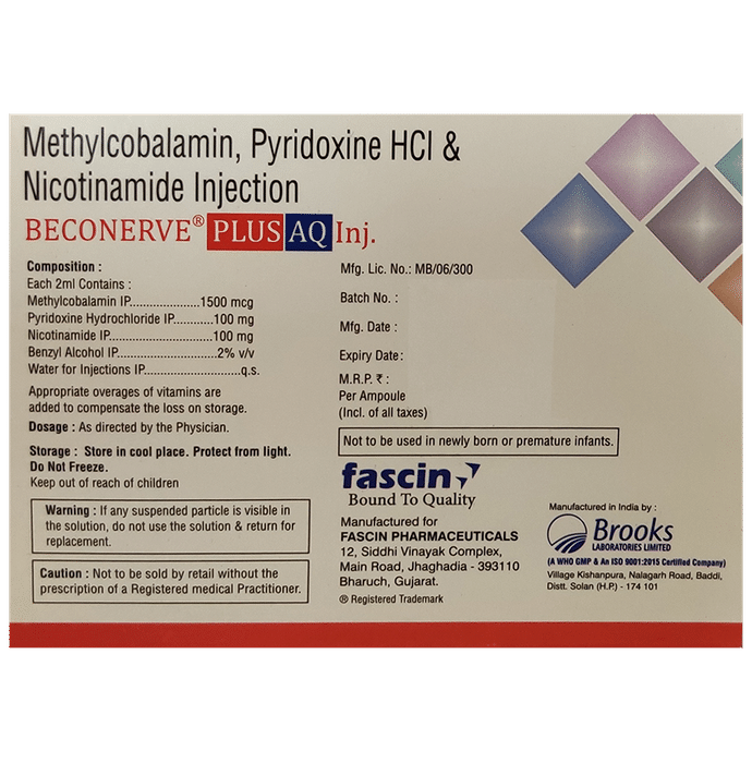 Beconerve Plus AQ Injection is a prescription medicine. It has a combination of vitamins that is prescribed to treat vitamin and other nutritional deficiencies. It ensures the proper growth and functioning of the body. Beconerve Plus AQ Injection injection is administered under the supervision of a healthcare professional. You are not advised to self administer this injection. Inform your doctor if you have any known allergy from this medication.You may experience symptoms of injection site reactions such as redness, swelling, and pain. Usually, they go away with time but if these symptoms persist for a longer duration, please consult your doctor. Inform your doctor if you are suffering from any disease or are taking any medicines.