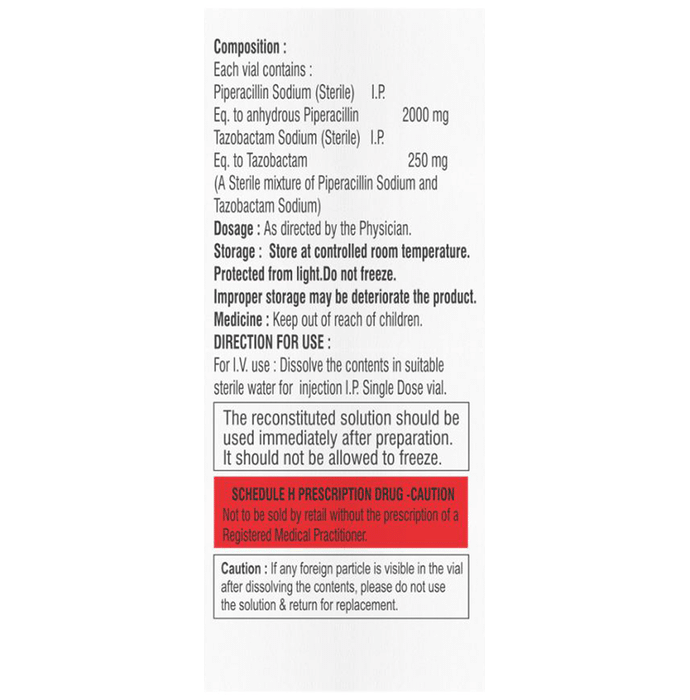 Tazotrip 2000mg/250mg Injection is a combination of two antibiotics. It is used to treat various types of bacterial infections. It fights against the infection by killing the microorganisms. Tazotrip 2000mg/250mg Injection is generally administered by a healthcare professional and should not be self-administered. Depending on the severity of your underlying illness, your doctor will decide the precise dose and schedule as per which this injection is to be given. It is strictly advised to be used as per the doctor
