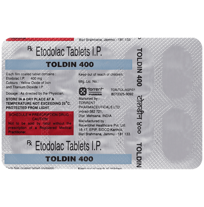 Toldin 400 Tablet is a pain-relieving medicine. It effectively alleviates pain and inflammation in conditions like rheumatoid arthritis, osteoarthritis, and acute pain. Toldin 400 Tablet should be taken in the dose and duration as advised by your doctor. It should be taken with food or milk to prevent stomach upset. Inform your doctor if you have any history of heart disease or stroke.Vomiting, stomach pain, nausea, and indigestion are some of the common side effects that might be observed on taking this medicine. It may also cause dizziness, drowsiness, or visual disturbances. Your doctor may regularly monitor your kidney function, liver function, and levels of blood components if you are taking this medicine for long-term treatment. Long-term use may lead to serious complications such as stomach bleeding and kidney problems.
