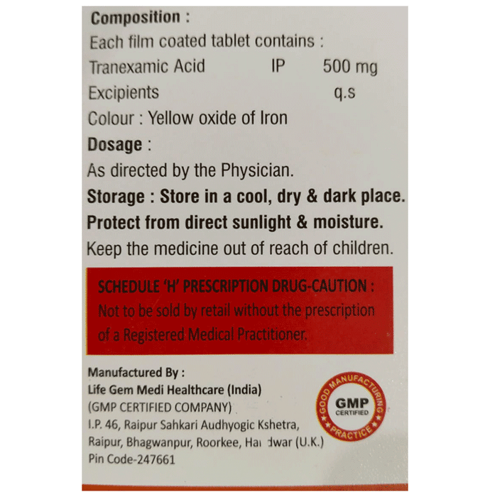 Tranostar 500 Tablet is used to treat bleeding. It helps to prevent or reduce bleeding in conditions like tooth removal, heavy periods, dysfunctional uterine bleeding, nosebleed, and in any oral, prostate, or bladder surgery. Tranostar 500 Tablet is an anti-fibrinolytic. It works by preventing the breakdown of clots which leads to the stoppage of bleeding. This medicine must be taken in the dose and duration as advised by the doctor. You should not take it if you have any known allergy to this medicine.The most common side effects include tiredness and pain in muscle, bone, or joint. Inform your doctor if you have undergone any cardiac surgery or you are suffering from any kidney disease.This medicine is safe to use in pregnant or breastfeeding mothers. It is also safe to use in patients suffering from liver diseases. It is advised not to consume alcohol after taking this medicine as there can be excessive drowsiness.