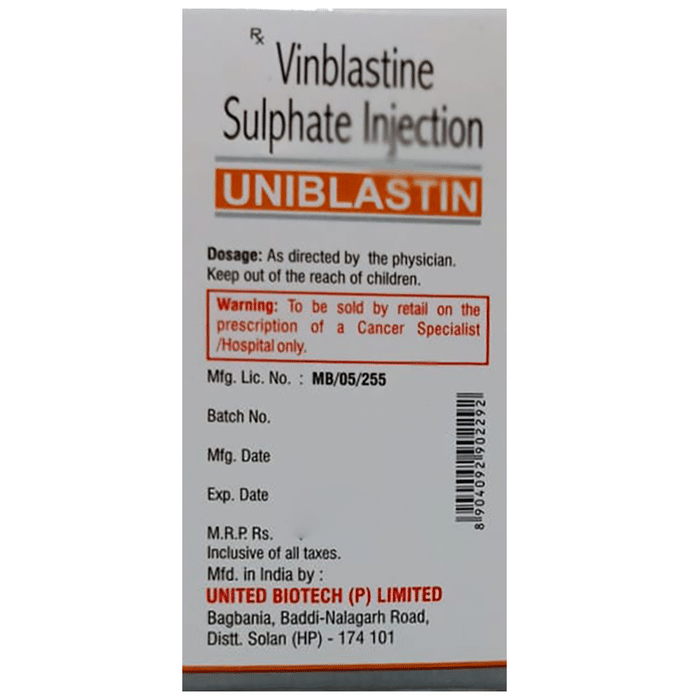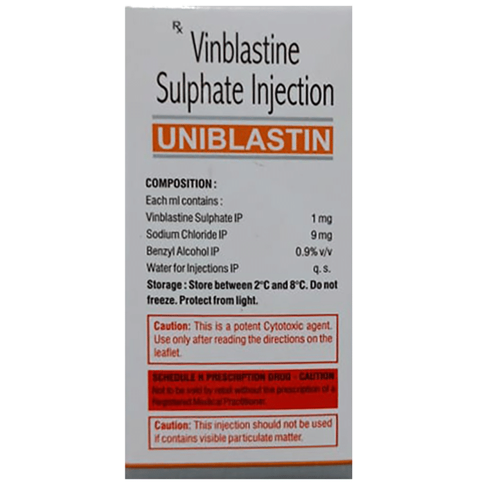 Uniblastin 10mg Injection is an anti-cancer medication used in the treatment of breast cancer, kidney cancer, Hodgkin