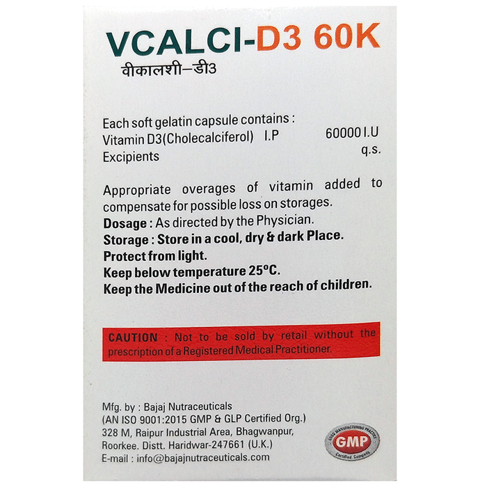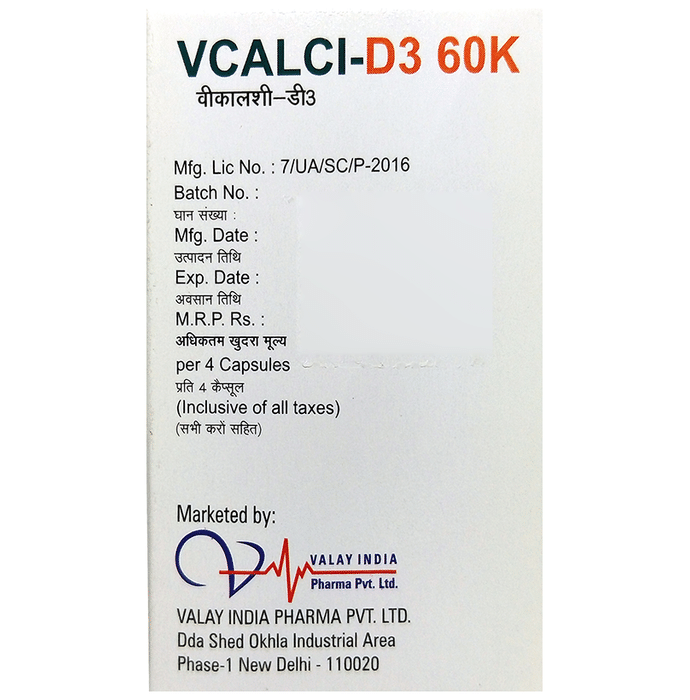 Vcalci-D3 60K Softgel Capsule is used to treat vitamin D deficiency and osteoporosis. It helps the body absorb calcium, which is essential for maintaining strong and healthy bones. It is used when the diet does not provide enough. Vcalci-D3 60K Softgel Capsule should be taken as directed by your doctor. It is best taken with or after food as this helps your body absorb it, and you should take it regularly to get the most benefit. If you are using it to treat osteoporosis, you will also be prescribed other medicines. This medicine may be only part of a complete treatment program that includes making changes to your diet and taking calcium and vitamin supplements. Learn about the foods you should eat to ensure you get enough calcium and vitamin D.Vcalci-D3 60K Softgel Capsule has few side effects, and none are common. If you take too much, you may feel weakness, muscle pain, or a metallic taste in your mouth. If you experience any such side effects, speak with your doctor. They may be able to help you reduce or treat the symptoms.Before taking this medicine, tell your doctor if you have high calcium levels in your blood or if you have any heart, kidney, or liver disease. Some other medicines can decrease the absorption of vitamin D3, so let your doctor know all other medicines you are taking to make sure you are safe. This medicine may help during pregnancy when your body needs more vitamin D, but too much could harm your baby. Discuss with your doctor.
