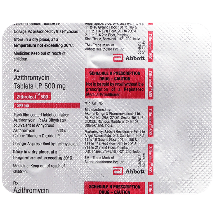 Zithrolect 500 Tablet is an antibiotic used to treat various types of bacterial infections of the respiratory tract, ear, nose, throat, lungs, skin, and eye in adults and children. It is also effective in typhoid fever and some sexually transmitted diseases like gonorrhea. Zithrolect 500 Tablet is taken orally, preferably one hour before or 2 hours after a meal. It should be used regularly at evenly spaced time intervals as prescribed by your doctor. Do not skip any doses and finish the full course of treatment even if you feel better. Stopping the medicine too early may lead to the return or worsening of the infection.Commonly seen side effects seen with this medicine include vomiting, nausea, stomach pain, headache, and diarrhea. These are usually temporary and subside with the completion of treatment. Consult your doctor if you find these side effects worry you or persist for a longer duration.Do not use Zithrolect 500 Tablet if you have a history of cholestatic jaundice or hepatic dysfunction that happened with the use of azithromycin. Inform your doctor if you have any previous history of allergy or heart problems before taking this medicine. Pregnant or breastfeeding women should consult their doctor before using this medicine.