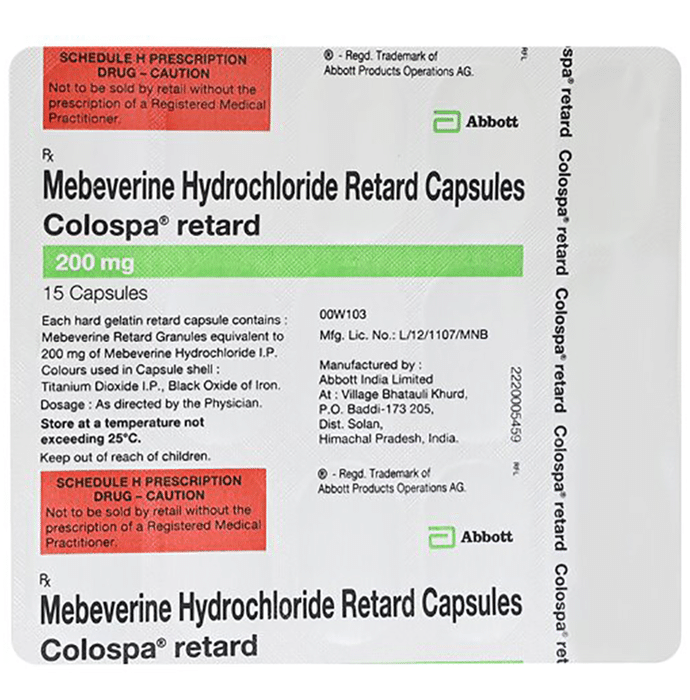 Colospa Retard Capsule is a prescription medicine used to treat and relieve symptoms of irritable bowel syndrome such as stomach pain and spasm, cramps in the abdomen, gas, bloating, and changes in bowel habits. This medicine relaxes muscles of the intestine and relieves spasms. Colospa Retard Capsule should be taken in a dose and duration as advised by your doctor. It is swallowed whole with a drink of water preferably 20 minutes before a meal to relieve or reduce post-meal symptoms. Let your doctor know about all other medications you are taking as some may affect, or be affected by this medicine. You should keep taking this medicine for as long as your doctor recommends. If you stop treatment too early your symptoms may come back and your condition may worsen. Remember following lifestyle modifications like having a fiber-rich diet, increase fluid intake and regular exercise can help you to get better results.This medicine has very less or minimal side effects but it may cause skin rash, fainting, or angioedema sometimes. Be cautious as it is important to stop the medication and inform the doctor if you encounter difficulty in breathing or swelling of the face, neck, tongue, or throat.Before taking this medicine, you should let your doctor know if you have liver and kidney problems. Pregnant or breastfeeding women should also consult their doctor before taking this medicine.