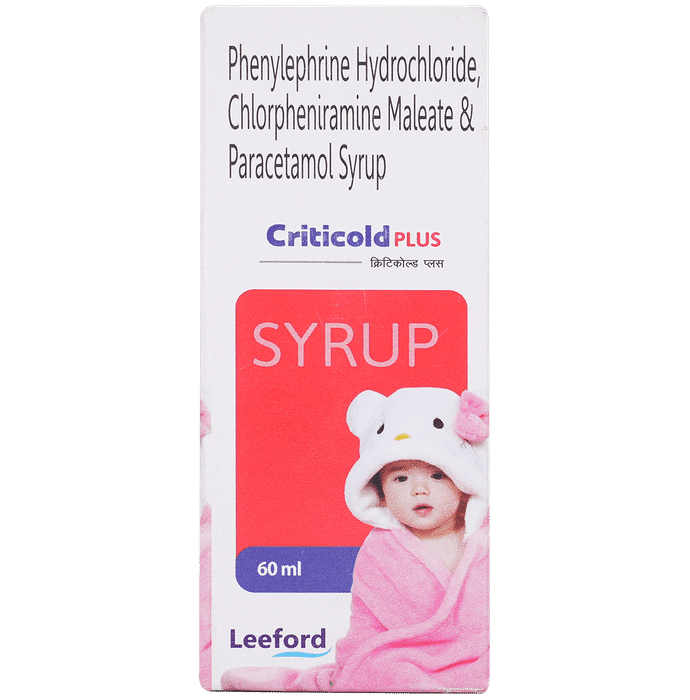 Criticold Plus Syrup is a medicine used in the treatment of common cold symptoms. It provides relief from symptoms such as headache, sore throat, runny nose, muscular pain, and fever. Criticold Plus Syrup can be taken with or without food. The dose and duration will depend on the severity of your condition. You should keep taking the medicine even if you feel better until the doctor says it is alright to stop using it.Using this medicine may cause a few common side effects such as nausea, vomiting, sleepiness, dizziness, and headache. If any of these side effects do not resolve with time or get worse, you should let your doctor know. Your doctor may be able to suggest ways of preventing or reducing the side effects. In general, you should try to use the smallest amount necessary to control your symptoms.Before using the medicine, you should tell your doctor if you have any other medical conditions or disorders. To make sure it is safe, you should let your doctor know all the other medicines you are taking. Also, tell your doctor if you have any problems with the liver or kidneys. Avoid consumption of alcohol while on treatment with this medicine as it may increase the chance of some side effects. Pregnant and breastfeeding women should consult their doctors first before using the medicine.