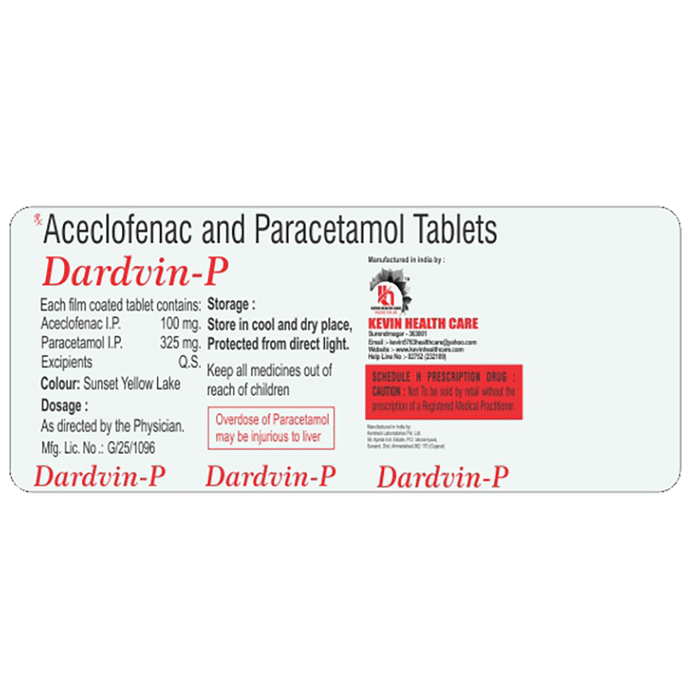 Dardvin-P Tablet is a pain-relieving medicine. It is used to reduce pain and inflammation in conditions like rheumatoid arthritis, ankylosing spondylitis, and osteoarthritis. It may also be used to relieve muscle pain, back pain, toothache, or pain in the ear and throat. Dardvin-P Tablet should be taken with or without food. You should take it regularly as advised by your doctor. Your doctor may change the dose and time between doses according to your pain level and your needs. Do not take more or use it for a longer duration than recommended by your doctor.Some of the common side effects of this medicine include nausea, vomiting, stomach pain, heartburn, and diarrhea. If any of these side effects bother you or do not go away with time, you should let your doctor know. Your doctor may help you with ways to reduce or prevent these side effects by prescribing an alternative medicine or adjusting the dose.Dardvin-P Tablet may not be suitable for everybody. Before taking it, let your doctor know if you have any problems with your heart, kidneys, liver, or have stomach ulcers. To make sure it is safe for you, let your doctor know about all the other medicines you are taking. Pregnant and breastfeeding mothers should first consult their doctors before using Dardvin-P Tablet.