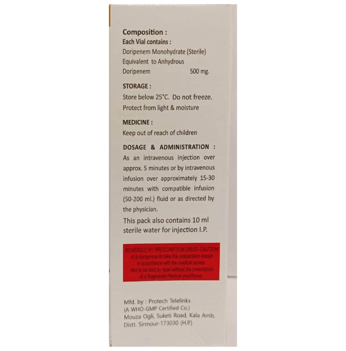 Dorista Injection is an antibiotic medicine that is used to treat severe infections of the skin, lungs, stomach, urinary tract, blood, and brain (e.g., meningitis). It works by killing the bacteria that cause these infections. Dorista Injection is commonly used to treat seriously ill patients admitted to the hospital. This medicine is given by drip or by direct injection into a vein, under the supervision of a healthcare professional. The dose will depend on what type of infection you have, where it is in the body, and how serious it is. You should keep on taking the injection for as long as you have been prescribed, even if your symptoms quickly improve. If you stop taking it too early the infection may return or worsen.Some people may develop side effects like headache, nausea, diarrhea, and rash. These side effects are usually temporary and go away as your body adjusts to the medicine. Consult your doctor if these side effects bother you or persist.Before starting treatment with this medicine, you should tell your doctor if you have epilepsy, liver, or kidney problems or if you are allergic to any antibiotic. While using it, you may be advised blood tests to monitor your blood cell counts and kidney function. This medicine is generally regarded as safe to use in pregnancy and breastfeeding if prescribed by your doctor.
