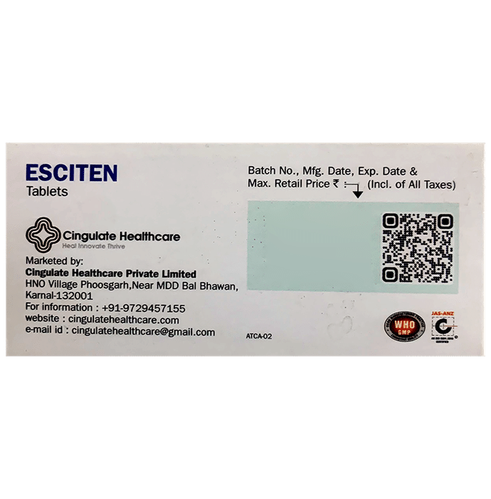 Take this medicine in the dose and duration as advised by your doctor. Swallow it as a whole. Do not chew, crush or break it. Esciten Tablet may be taken with or without food, but it is better to take it at a fixed time.