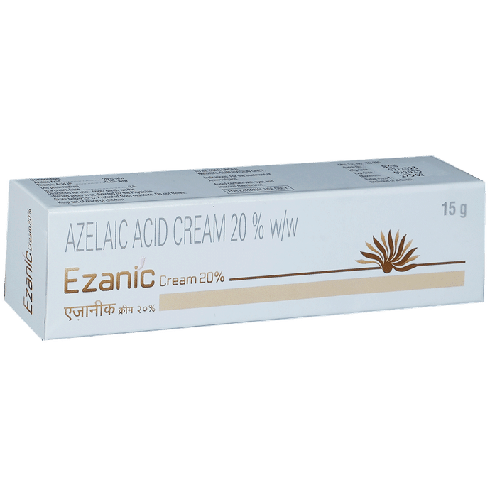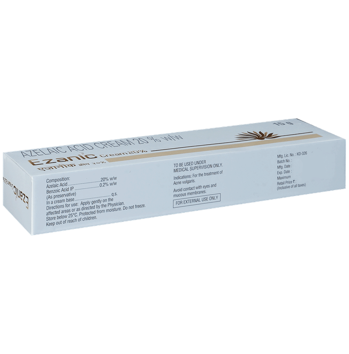 Ezanic 20% Cream is used in the treatment of acne (pimples). It effectively relieves symptoms such as lumps, redness, and swelling associated with different forms of acne. It works by killing acne-causing bacteria. Ezanic 20% Cream is for external use only. You should always use it exactly as prescribed. Both the affected area and your hands should be clean and dry before application. Use this medicine regularly to get the most benefit from it. Do not use more than you need as it will not clear your condition faster and some side effects may be increased. If your condition goes on for longer than four weeks or gets worse at any time, let your doctor know. You can help this medication work better by keeping the affected areas clean.Ezanic 20% Cream has a few potential side effects but not everyone will get them. These include application site reactions like burning, irritation, itching, and redness. Let your doctor know if you