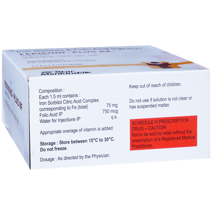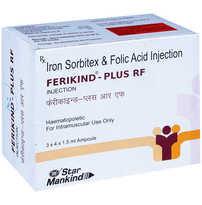 Ferikind Plus Injection is an iron replacement product. It is used to treat a type of anemia in which the number of red blood cells is less due to a low level of iron in your body (iron-deficiency anemia). Iron is needed to produce the red blood cells that carry oxygen around your body. Ferikind Plus Injection is generally given by a doctor or a nurse. You will be watched carefully to make sure you do not have an allergic reaction. The dose and duration will depend on the cause and severity of your anemia. It is advisable to eat iron-rich foods such as meat, eggs, raisins, broccoli and lentils along with taking Ferikind Plus Injection. The most common side effects include vomiting, nausea, dark-colored stools, constipation, and diarrhea. Most of these usually go away within a short time. But if you are bothered by them or if the side-effects continue, talk to your doctor.You should not have this medicine if your anemia is not caused by a lack of iron. Before taking it, tell your doctor if you have rheumatoid arthritis, asthma or other allergies, high blood pressure, or liver problems. This may affect your treatment. It is not known whether this medicine is safe for use if you are pregnant or breastfeeding so please consult your doctor. You will have tests to check your blood cells and iron levels, monitor your progress and check for side effects. It may be advisable to limit alcohol during treatment.