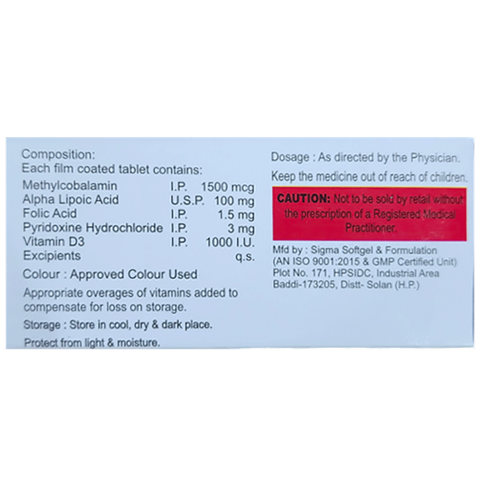 Methylcobalamin (1500mcg) + Alpha Lipoic Acid (100mg) + Vitamin B6 (Pyridoxine) (3mg) + Folic Acid (1.5mg) + Vitamin D3 (1000IU)