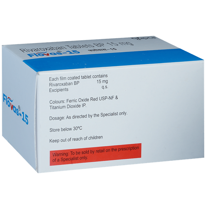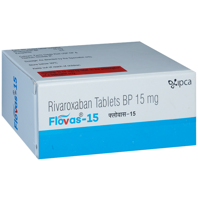 Flovas 15mg Tablet is a medicine known as an anticoagulant or blood thinner. It helps prevent and treat blood clots. It is used to reduce the risk of stroke and heart attack. It prevents and treats clot formation in the veins of your legs, lungs, brain and heart. Flovas 15mg Tablet is commonly used in patients with irregular heart rhythm (atrial fibrillation) to prevent clot formation. It also reduces the risk of getting clots in people who have undergone knee or hip replacement surgeries. It may be taken with or without food. Take it at the same time each day for maximum benefits. You may need to take this medicine for many years, even for life in some cases. Do not stop taking it or change the dose without guidance from your doctor. It could quickly put you more at risk of having a heart attack, stroke, or thrombosis (formation of a blood clot within a blood vessel). You can reduce your risk of having a blood clot by making changes to your lifestyle, such as not smoking, eating a healthy diet, getting regular exercise, and losing weight if you need to.The most common side effect of Flovas 15mg Tablet is bleeding more easily than normal, for example, having nosebleeds or bruising. If you experience any symptoms, tell your doctor immediately. Do not take this medicine if you have severe kidney or liver problems, if you are currently bleeding or if you are taking other medicines to reduce blood clotting. You should not breastfeed while using this medicine. Unlike other anticoagulants, a regular blood test (PT-INR) is not required while taking this medicine.