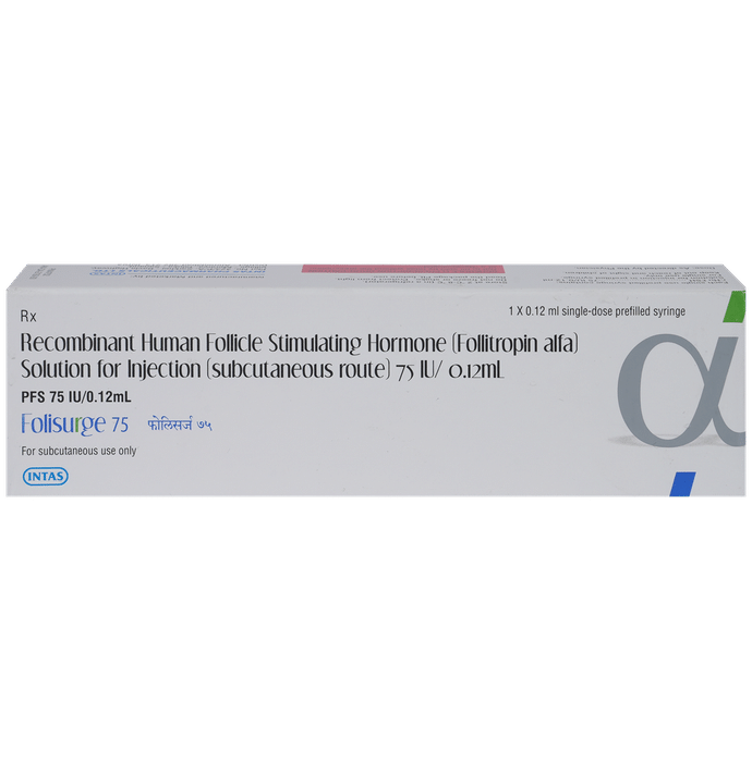Folisurge 75 Injection is used in the treatment of infertility in women. It is also helpful in the treatment of male hypogonadism (delayed puberty, and low sperm count). It works by releasing the eggs from the ovary in women and by increasing the testosterone level in men. Folisurge 75 Injection is given as an injection under the supervision of a doctor. Your doctor will decide the right time to take the injection, so always follow your doctor's advice. The dose and how often you take it depends on what you are taking it for. You should take this medicine for as long as it is prescribed for you.The most common side effects of this medicine include allergic reactions, headache, swelling of the breast in males, and acne. If these bother you or appear serious, let your doctor know. There may be ways of reducing or preventing them.Before taking this medicine, tell your doctor if you have ever had heart disease, or had an ovarian cyst, or had thyroid gland disorder. Your doctor should also know about all other medicines you are taking as many of these may make this medicine less effective or change the way it works. Tell your doctor if you are pregnant or breastfeeding. You should avoid alcohol or have to follow doctor advice related to diet while taking this medicine.