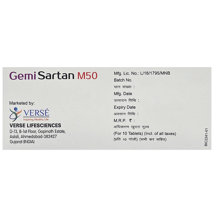 Gemisartan M 50 Tablet ER is a medicine used for treating high blood pressure. By lowering blood pressure, it helps in preventing future heart attacks and strokes. Early treatment with this medicine also improves the chances of survival in patients with heart attacks. It is advised to take Gemisartan M 50 Tablet ER with food at a fixed time each day to maintain consistent levels of medicine in the blood. Keep taking it for as long as advised by your doctor. Even if you feel well, do not stop this medicine on your own because high blood pressure often has no symptoms. If you stop taking it, your condition may get worse. Keeping active with regular exercise, reducing your weight and eating a healthy diet will also help control your blood pressure. Follow your doctor