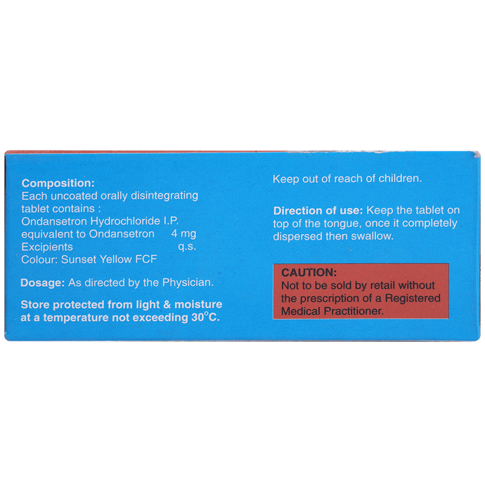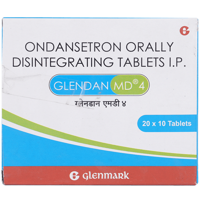 Glendan MD 4 Tablet is an antiemetic medicine commonly used to control nausea and vomiting due to certain medical conditions like stomach upset. It is also used to prevent nausea and vomiting caused due to any surgery, cancer drug therapy, or radiotherapy. Glendan MD 4 Tablet may be used alone or with other medications and can be taken with or without food. Your doctor will suggest the appropriate dose depending on what you are taking it for. The first dose is normally taken before the start of surgery, chemotherapy, or radiotherapy. After these treatments, take any further doses as prescribed by your doctor (normally only for a few days at most). Take it regularly at the same time(s) each day to get the most benefit. Be careful not to take too much. This medicine does not relieve other side effects associated with cancer treatments. Also, it has little effect on vomiting caused by motion sickness. The most common side effects of taking this medicine include headache, diarrhea, or constipation and feeling tired. These symptoms should disappear when you stop taking the medicine. However, if these side effects bother you or do not go away, your doctor may be able to suggest ways of preventing or reducing them. Before taking this medicine, tell your doctor if you have heart or liver problems or a blockage in your stomach or intestines. Also, tell your doctor about any other medicines you might be taking, especially medicines to treat epilepsy, heart problems, cancer, and depression. These may affect, or be affected by, this medicine. If you are pregnant or breastfeeding, ask for advice from your doctor.