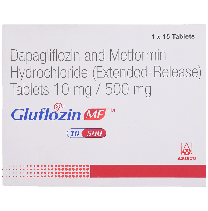 Gluflozin MF 10mg/500mg Tablet is a combination of two medicines used to treat type 2 diabetes mellitus. It helps control the high blood sugar levels seen in diabetes. This reduces the chances of serious complications of diabetes and also helps prevent heart disease. Gluflozin MF 10mg/500mg Tablet may be taken with food. Take it at the same time every day, this will help you remember to take it. The dose will be decided by your doctor. Don