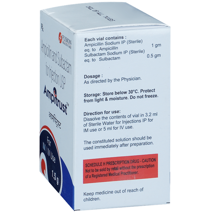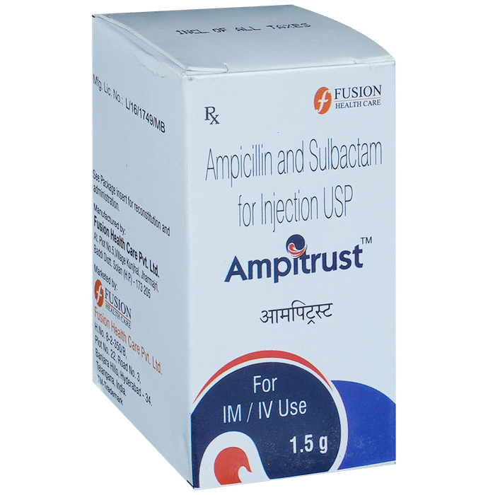 Ampitrust 1.5gm Injection is a combination of two antibiotics. It is prescribed to treat various types of bacterial infections. It fights against the infection by killing the microorganisms. Ampitrust 1.5gm Injection is generally administered by a healthcare professional and should not be self-administered. Depending on the severity of your underlying illness, your doctor will decide the precise dose and schedule as per which this injection is to be given. It is strictly advised to be used as per the doctor