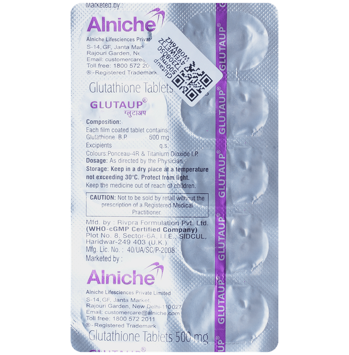 Glutaup 500mg Tablet is an antioxidant used in the treatment of liver disease and also used as a skin-lightening agent. It also has a number of other health benefits and protects the body cells against damage caused by harmful chemical substances (free radicals). Glutaup 500mg Tablet may be taken with or without food. Take it regularly and at a fixed time each day to get the maximum benefit from it. Inform your doctor before taking the medicine if you have any other medical conditions or are taking any other medications.Glutaup 500mg Tablet is generally well tolerated with little or no side effects. However, if you experience any symptoms which you think are caused by the medicine, inform your doctor. Pregnant and breastfeeding women must take this medicine only with a valid prescription.