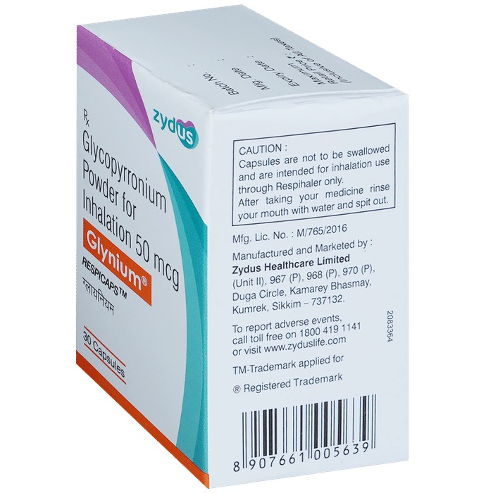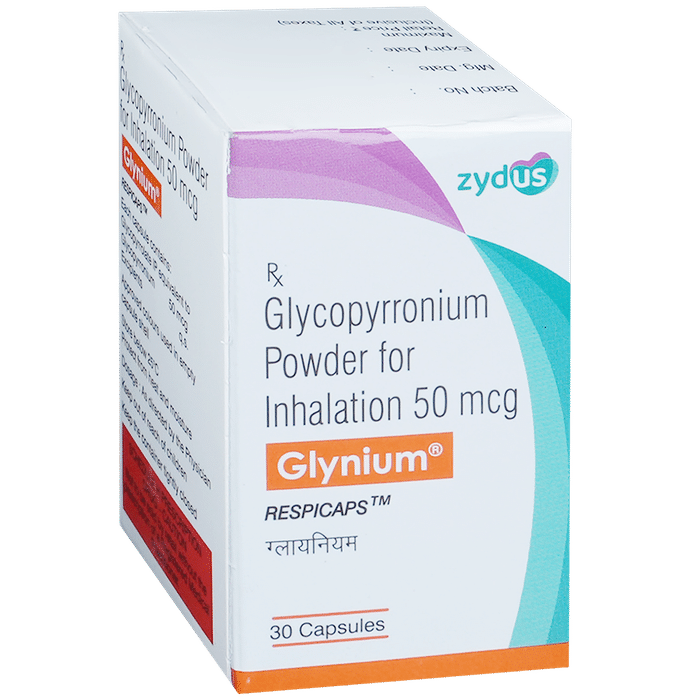 Glynium Respicap is used to treat chronic obstructive pulmonary disease (COPD). This medicine helps the muscles around the lungs to stay relaxed and reduces symptoms like coughing, chest tightness and shortness of breath. Your doctor will tell you how often you need to use Glynium Respicap. It is important that you take the lowest dose needed to effectively control your symptoms. The effect of this medicine may be noticeable after a few days but will only reach its maximum after a few weeks. This medicine must be used regularly to be effective, so continue using it even if you do not have any symptoms. If you stop taking it your symptoms of COPD may get worse. Thus, it should not be used to relieve sudden breathing problems. It is best to take the first dose of this medicine under medical supervision as it may cause wheezing or tightening of the airways.The most common side effects are sore throat, dry mouth, gastroenteritis, and insomnia. If you get these, do not stop taking it but do talk to your doctor. They may be able to help by adjusting the dosage or by precribing you an alternate medicine.Do not use this medicine if you have a known history to any of the ingredients of this product. This medicine may not be suitable for everybody, let your doctor know if you have any preexisting medical conditions. Let your doctor also know about all the medicines you are taking.