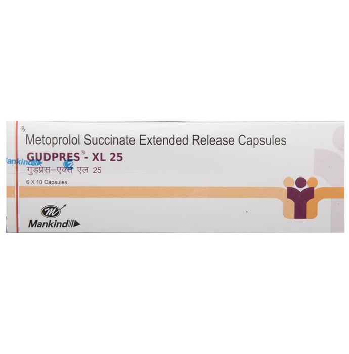 Gudpres-XL 25 Capsule belongs to a group of medicines called beta-blockers. It is used to treat high blood pressure (hypertension), angina (heart-related chest pain), and irregular heart rhythms (arrhythmia). It also helps to prevent migraines, future heart attacks, and stroke. Gudpres-XL 25 Capsule may be prescribed alone or together with other medications. The dose and frequency will depend on what you are taking it for and the severity of your condition. It may be taken empty stomach or with a meal, but take it regularly at the same time each day to get the maximum benefit. It may take several weeks before you get the full benefit of this medicine and you may need to take it for the rest of your life. However, it is important to continue taking it even if you feel well. Most people with high blood pressure do not have symptoms if you stop taking it your condition may worsen.The main side effects of Gudpres-XL 25 Capsule are tireness, headache, depression, diarrhea, rash, slow heart rate, feeling dizzy, and nausea. These are usually mild and short-lived. It may also cause shortness of breath or low blood pressure in some people. To reduce the risk of side effects your doctor will probably start the medicine at a low dose and gradually increase it. Consult your doctor if the side effects bother you or do not go away.Before taking it, let your doctor know if you have any liver problems. It may also not be suitable for people who have a slow heart rate, severe circulation problems, severe heart failure, or low blood pressure. Pregnant or breastfeeding mothers should also consult their doctor before taking it. You must talk to your doctor to find out whether this medicine is suitable for you to use. You should have your blood pressure checked regularly to make sure that this medicine is working properly. Avoid drinking alcohol as it may increase certain side effects.