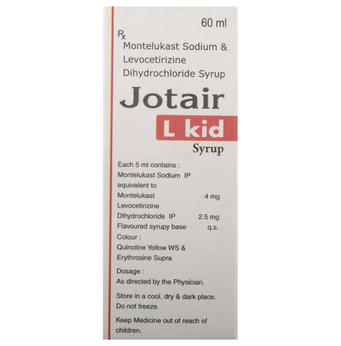 Jotair L Kid Syrup is commonly prescribed in children to treat symptoms of allergy such as runny nose, sneezing, itching, swelling, congestion, and watery eyes. It may also help in the treatment of asthma and skin allergies. Give this medicine to your child at a fixed time before or after food in the prescribed dose, time, and way. For asthma, prefer giving Jotair L Kid Syrup in the evening or 2 hours before physical activity. For allergy, it is best to give it either in the morning or in the evening, depending upon the time of onset of symptoms. In case your child has both, prefer giving it in the evening. If your child vomits within 30 minutes of taking this medicine, give the same dose again, but skip it if it